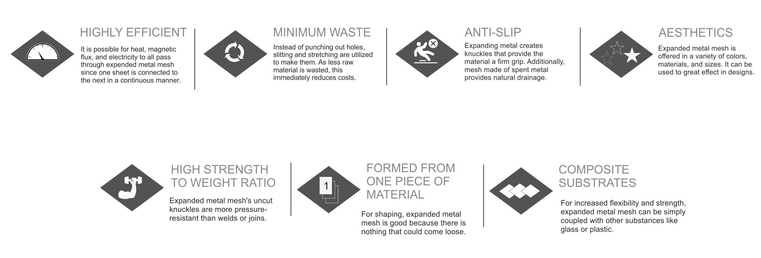 Product applications/uses include screening, ventilation, security enclosures, machine guards, ramps, catwalks, walkways, platforms, cabinet inserts and more. We invite you to browse Expended Metal applications in our Product and Application Gallery.